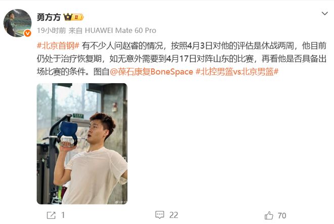 据媒体人勇方方的报道,按照4月3日对赵睿的评估是休战两周,他目前仍处于治疗恢复期,如无意外需要到4月17日对阵山东的比赛。这样的消息来看,他下周复出的可能性还是比较大的。