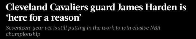 得到哈登后,骑士(51胜29负)取得19胜6负的战绩,正在与纽约尼克斯争夺东部季后赛三号种子。为骑士出战25场比赛,哈登场均贡献20.6分7.8助攻5.0篮板,他称自己目前的骑士生涯“棒极了”。